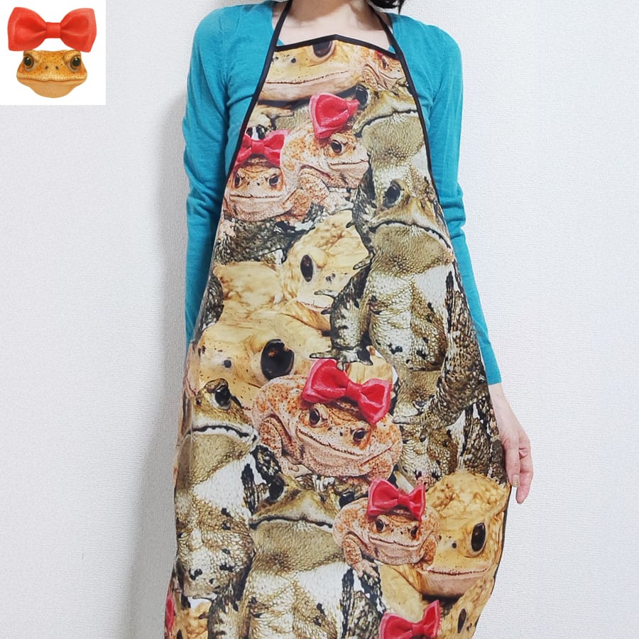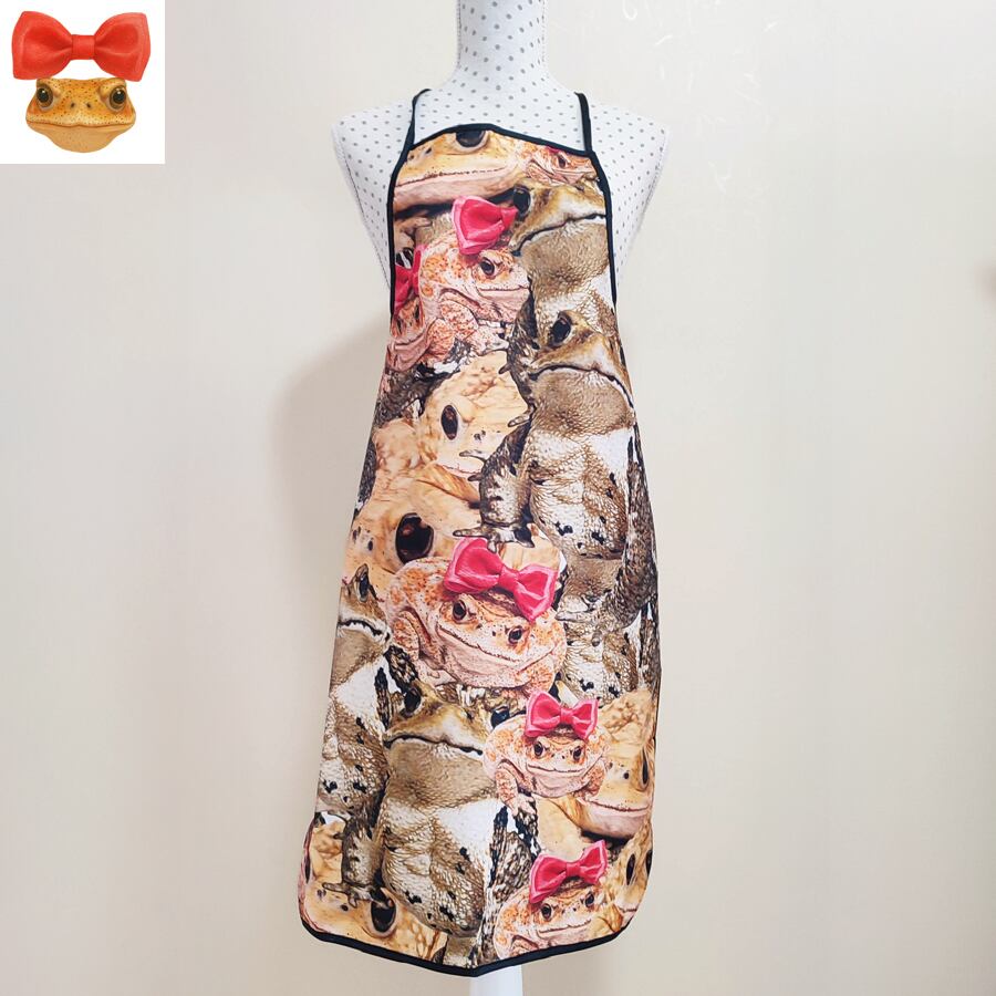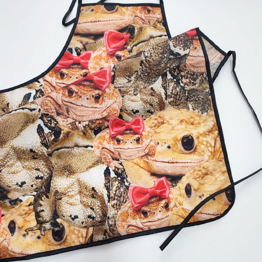 可愛いヒキガエルに埋め尽くされたエプロンです。