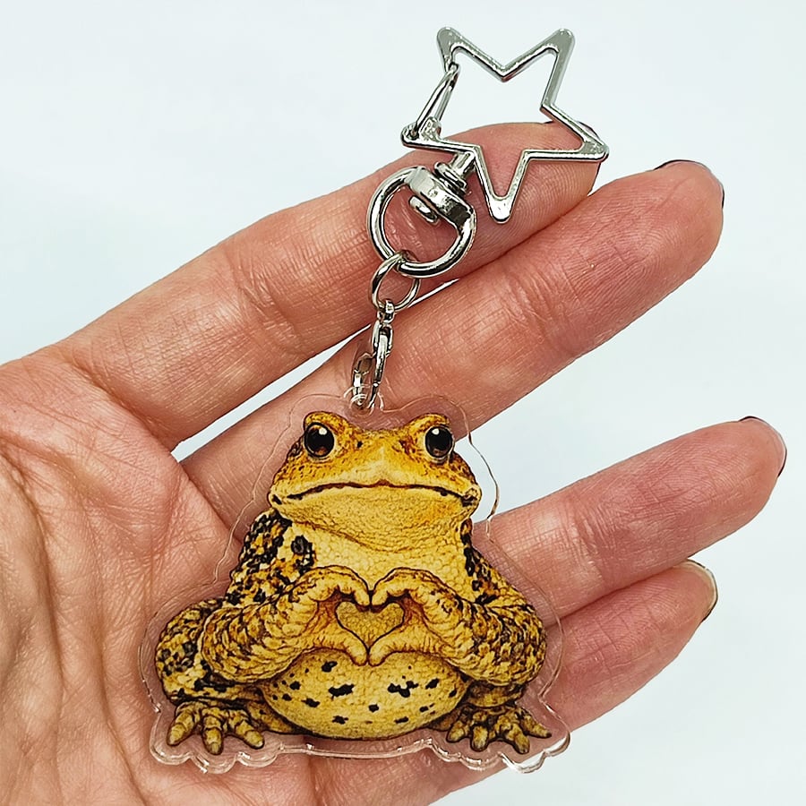 手をハートの形にしたイケメンヒキガエルのアクリルキーホルダーです。