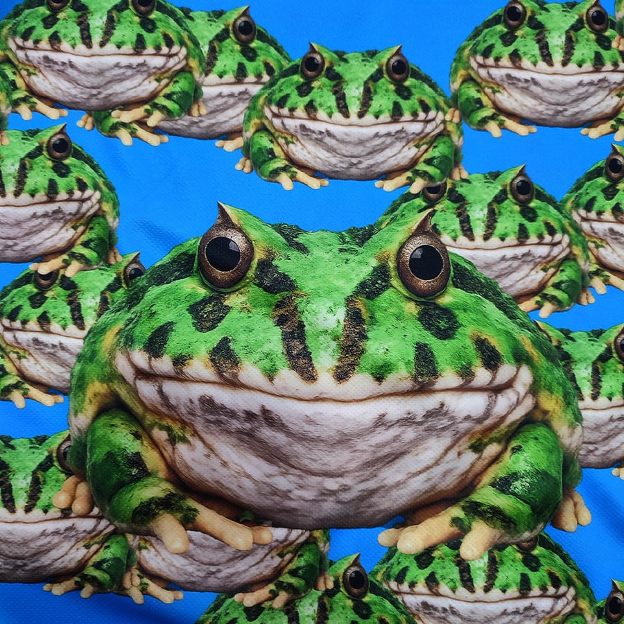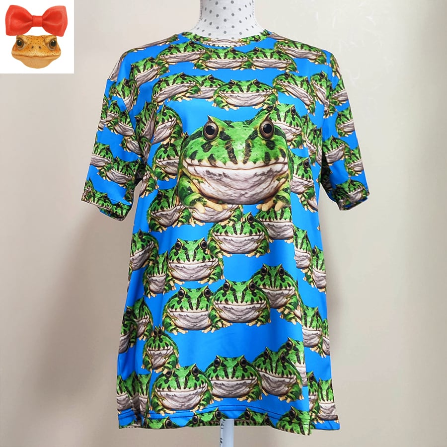 ブルー地にグリーンのクランウェルツノガエルがいっぱいのTシャツです。