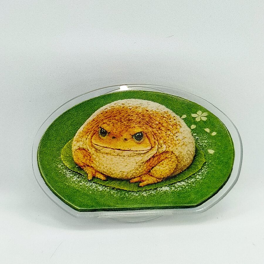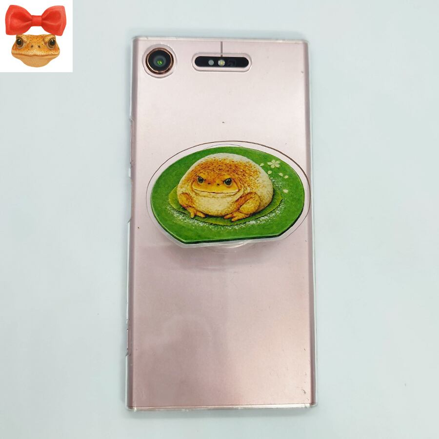ぽっちゃりヒキガエルが、おまんじゅうになってお皿に乗っているスマホグリップです。