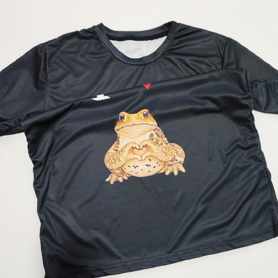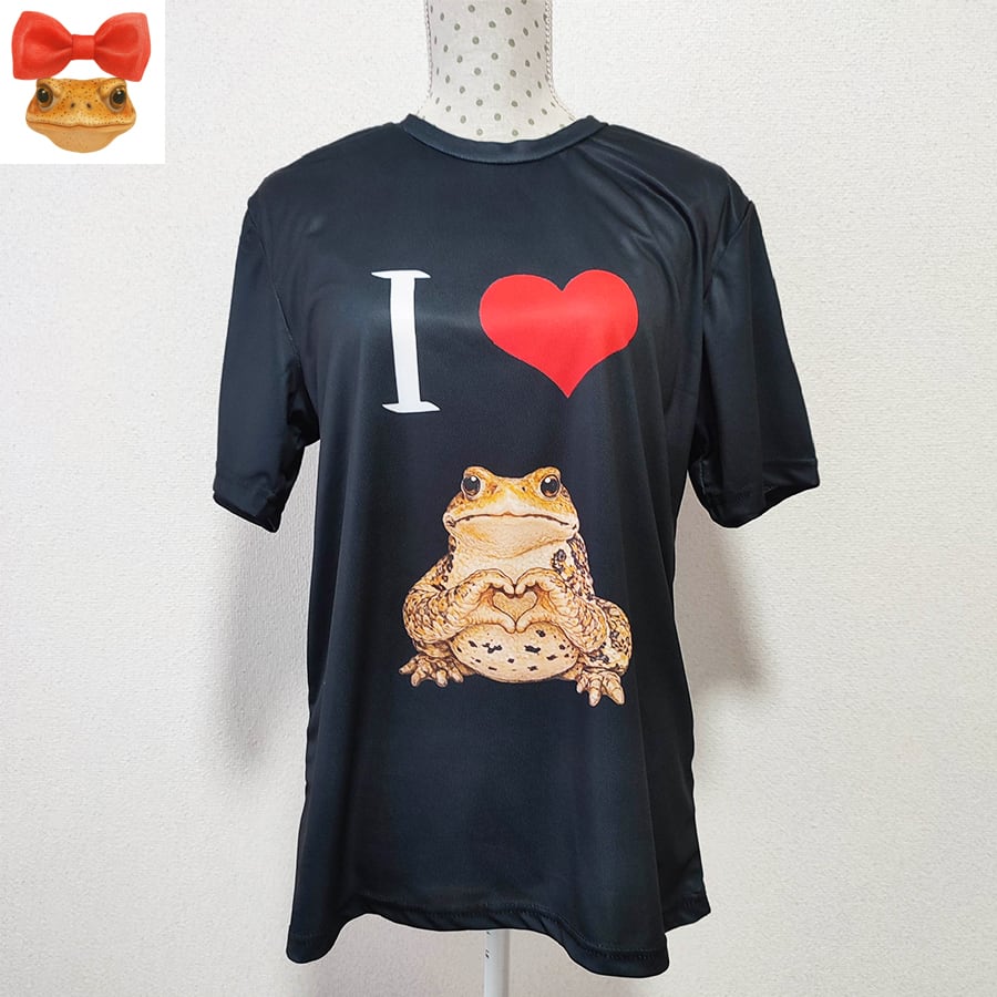 黒地に手をハートの形にしたヒキガエルのTシャツです。