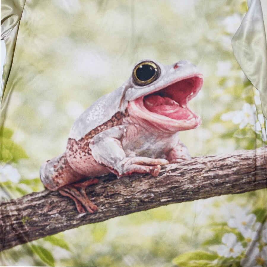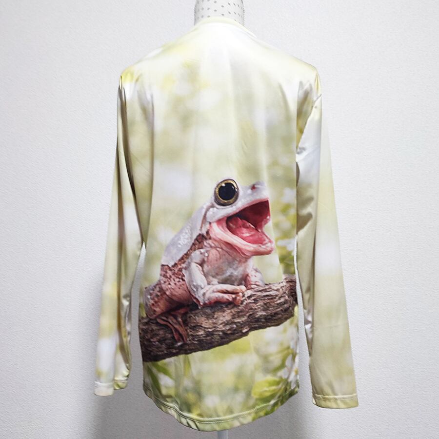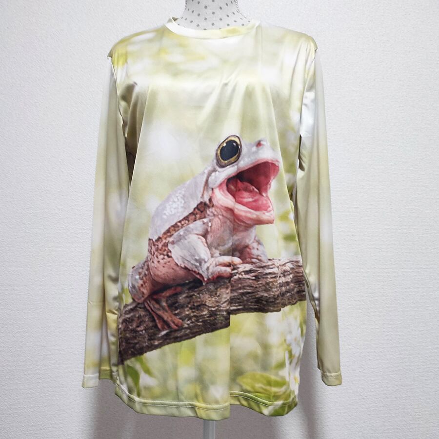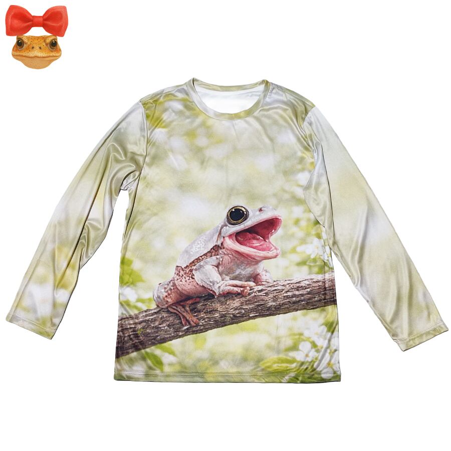 笑顔が可愛いシュレーゲルアオガエルの長袖Tシャツです。