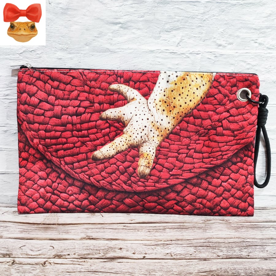 ヒキガエルの手が、おしゃれなクラッチバッグ持っているデザインのビッグポーチです。