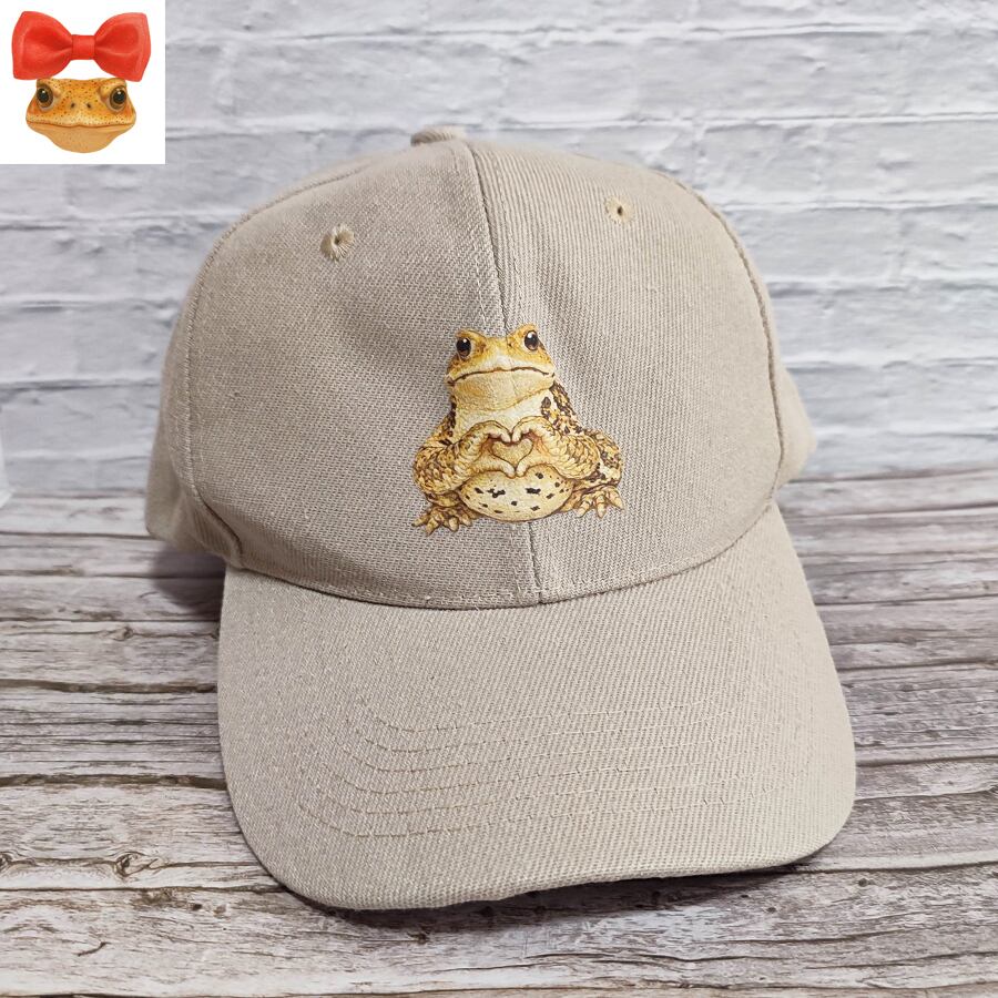手をハートの形にしたヒキガエルがプリントされたベースボールキャップです。