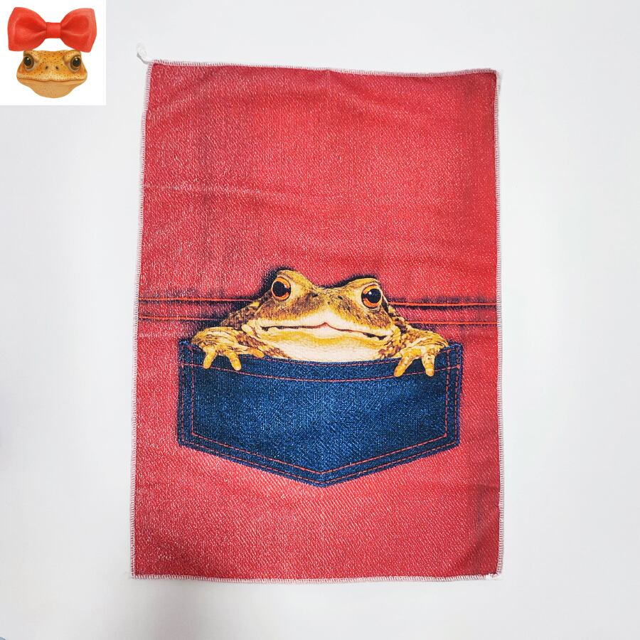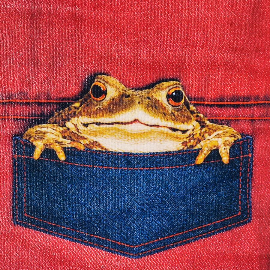 デニムのポケットに入ったヒキガエル柄のタオルです。